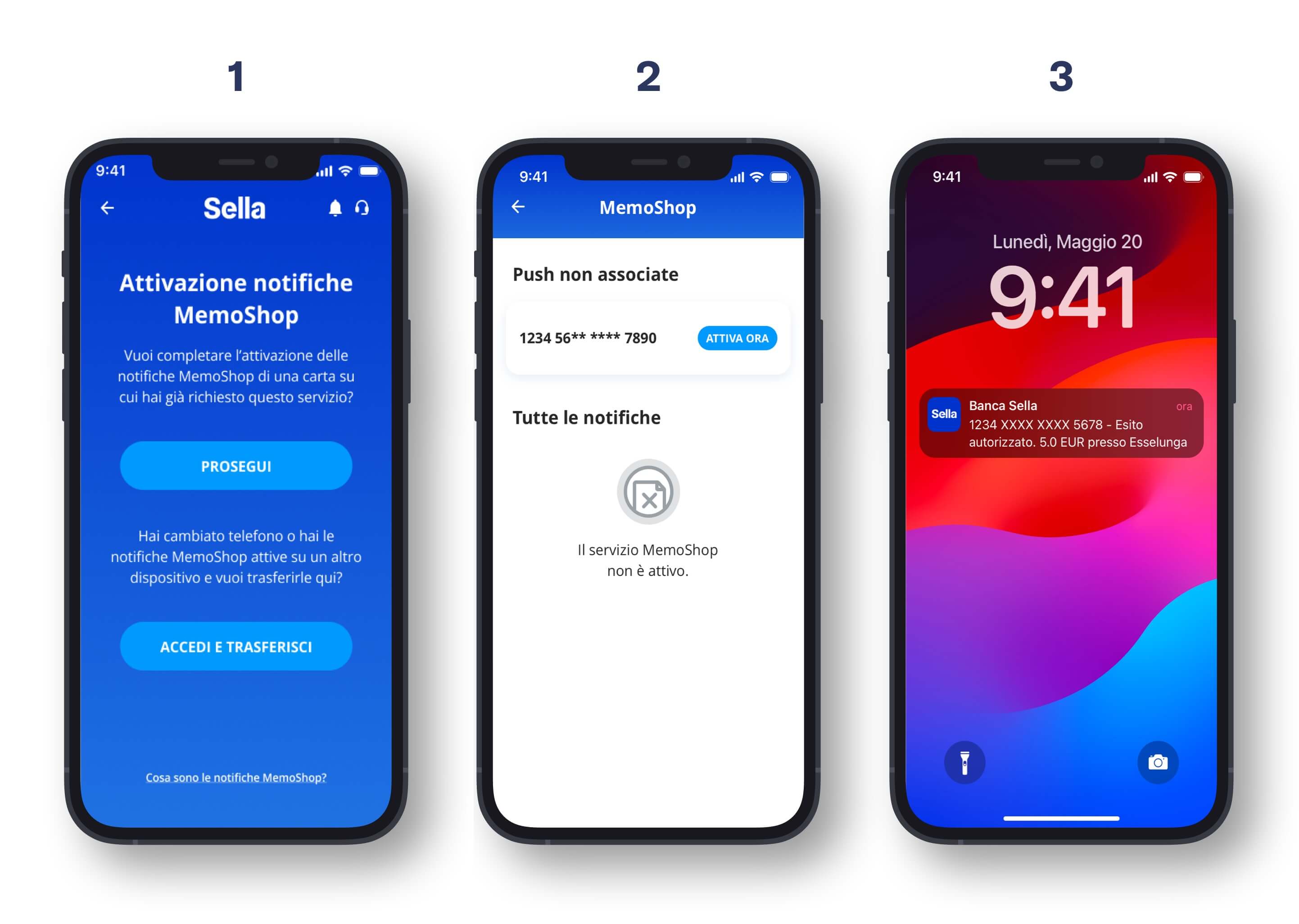 Se hai attivato il servizio push MemoShop sulle tue carte, associa il tuo dispositivo per ricevere le notifiche sullo smartphone dove hai installato l'app Sella. Per farlo vai nella sezione "Profilo > Notifiche Memoshop" o nella campanella in alto, sezione Memoshop, per gestire la modalità di ricezione, variando da SMS a Notifiche Push. - Trasferisci le notifiche push Memoshop da un dispositivo vecchio ad uno nuovo
